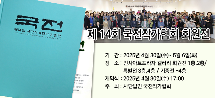 제13회 국전작가협회 회원전 2024. 05. 08(수) ▶ 2024. 05. 14(화) OPENING PM 4:00 서울특별시 종로구 인사동길 34-1 인사아트 프라자 갤러리 1,2,3층 (02-736-6347) ─ 출 품 작 가 ─ 강정완 공영석 박행보 강지주 최예태 이병석 곽석손 김동협 김신석 김영철 김재형 김정묵 김창식 박 남 박영대 박항환 서봉한 서영환 송...