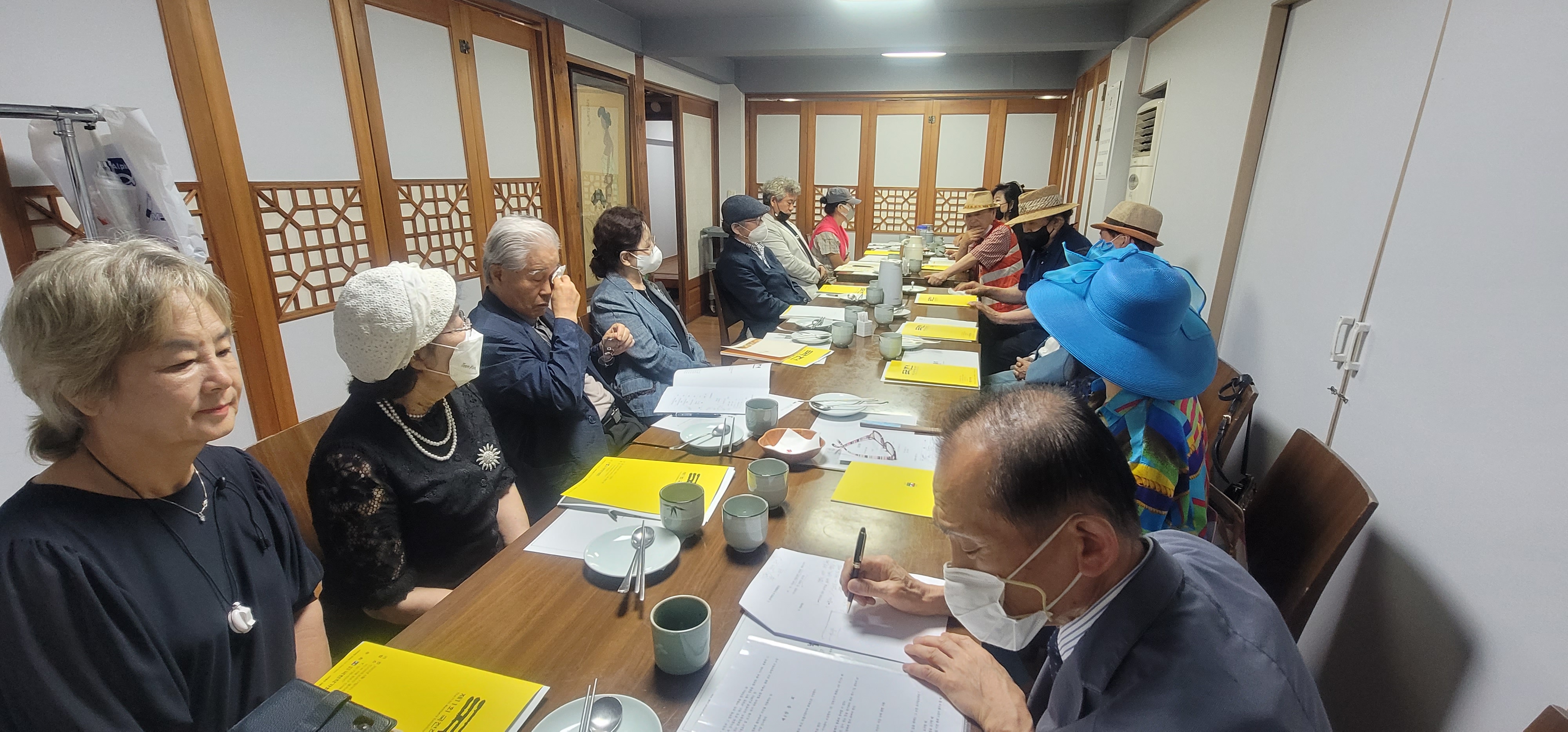 2022년도 제 2 회 총재단&이사 연석회의 일시 :6. 29. fri. 11:00 ~13:00 장소 : 인사동 宣 川 참석 : 직책생략 무순- 이연숙,양태석, 이흥남,성낙주, 신정무, 송 용, 선학균, 박정실, 김미자,서홍원, 권의철,서미정,유성복,김희자,김남수, 안진수,이금희,백정옥,양문숙